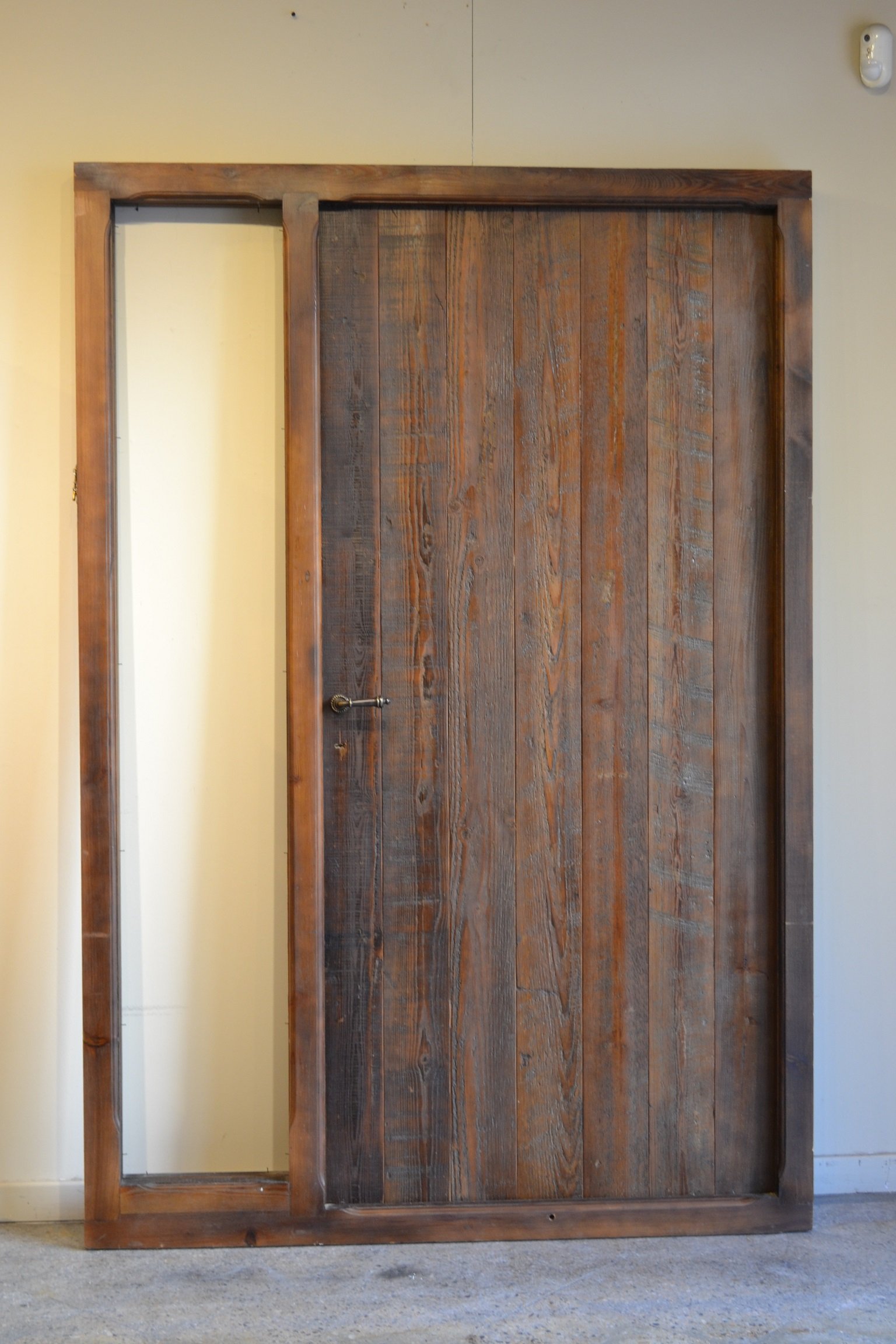 Las tablas verticales que componen la puerta añaden profundidad visual y textura. Cada tabla cuenta con marcas, nudos y variaciones de tonalidad que aportan un carácter distintivo y testimonian su pasado. La madera recuperada lleva consigo la historia de su uso anterior, lo que se refleja en su aspecto envejecido y desgastado de manera natural.