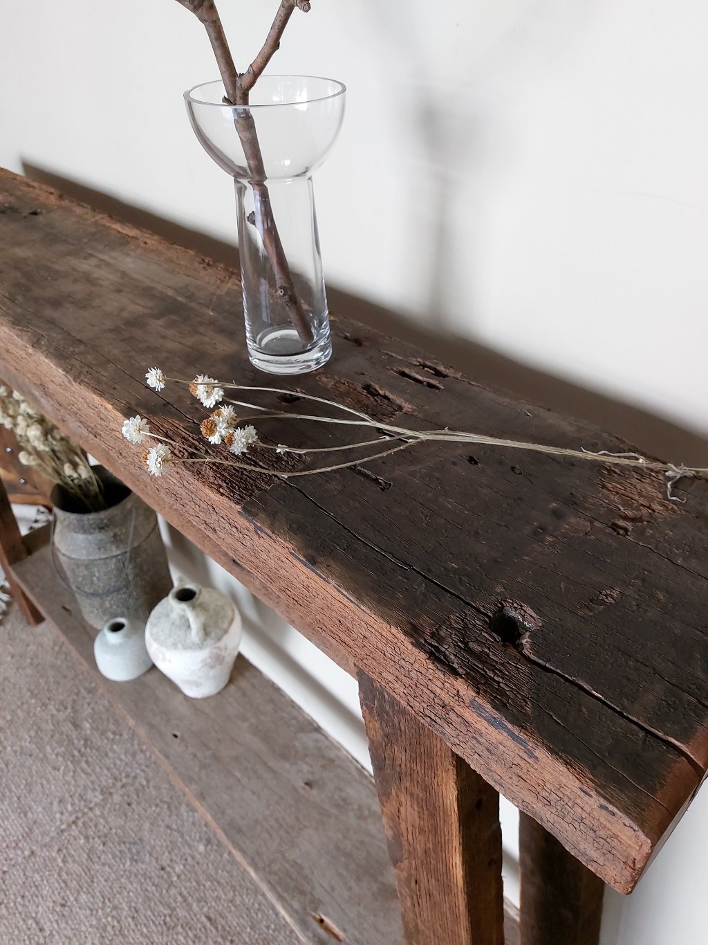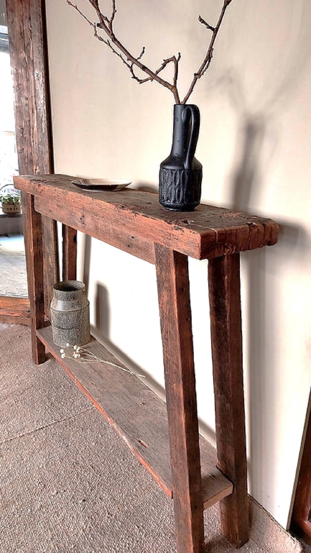 Disfruta de la belleza y la autenticidad de nuestro mueble recibidor de madera recuperada con patas en ángulo. Cada vez que lo utilices o lo admires en tu hogar, apreciarás la historia y la artesanía que se han fusionado para crear una pieza única y especial